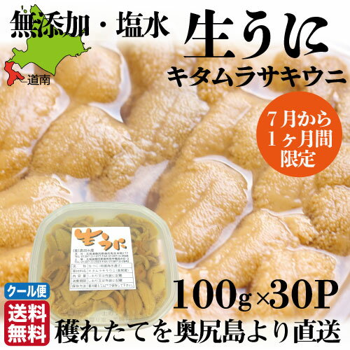 予約開始 超お得30パック【1ヵ月限定 奥尻島うに 】うに 北海道 ミョウバン不使用 高級 天然生うに 島ウニ塩水パック 3000g(100g×30パック) キタムラサキウニ 塩水うに 国産 雲丹 高級 海鮮 海鮮丼 お中元 ギフト【高田水産】送料無料 産地直送 産直 クール便 お土産 贈り物